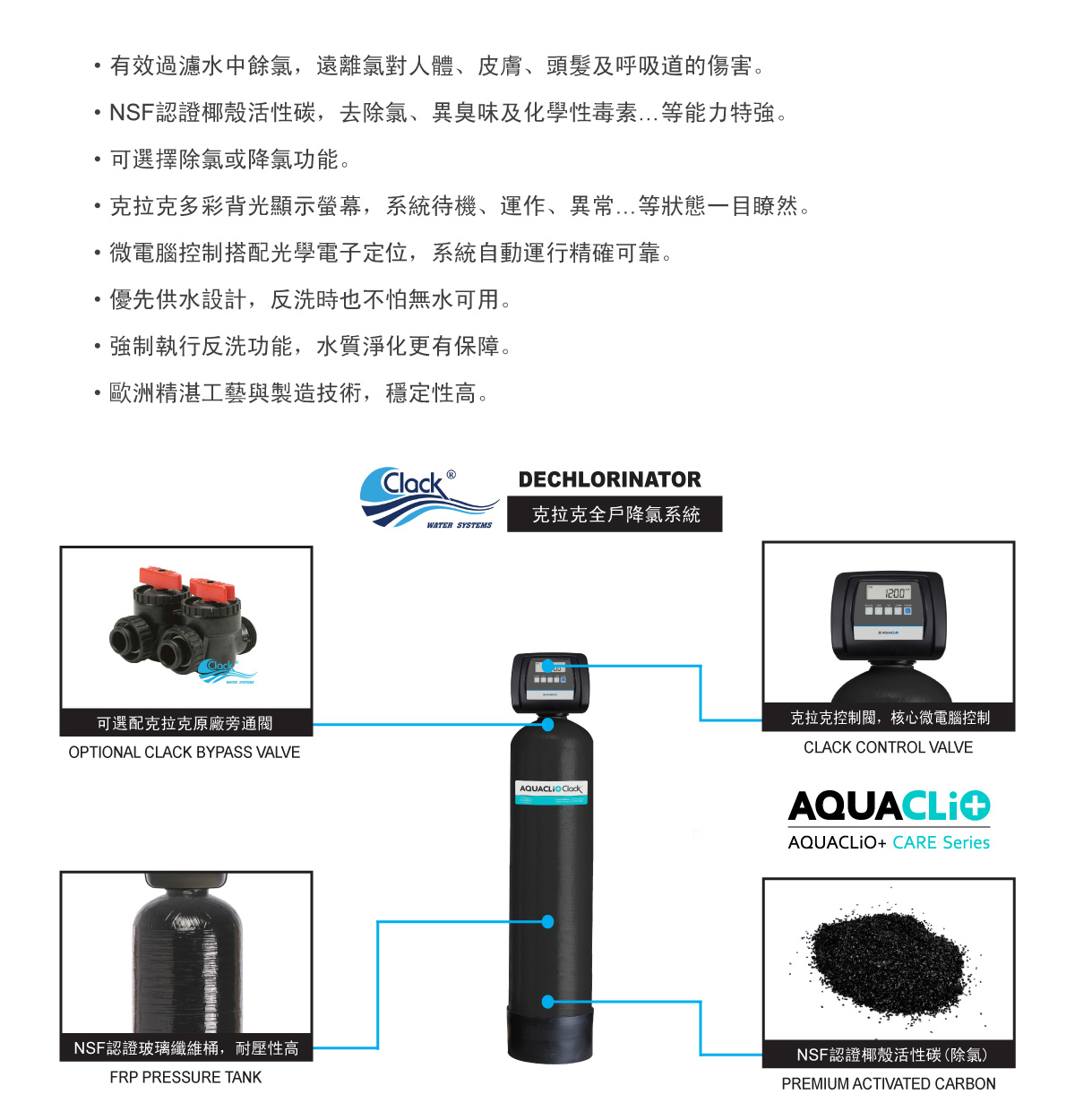 AQUACLiO+ CARE 智慧高效降氯淨水系統,克拉克多彩光學控制閥搭配椰殼活性碳,可選擇除氯或降氯功能,有效過濾水中餘氯,遠離氯對人體、皮膚、頭髮及呼吸道的傷害