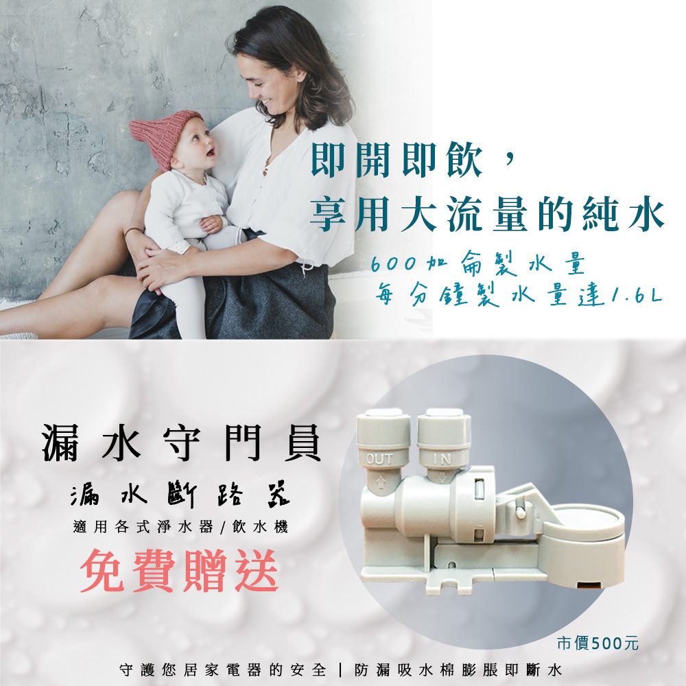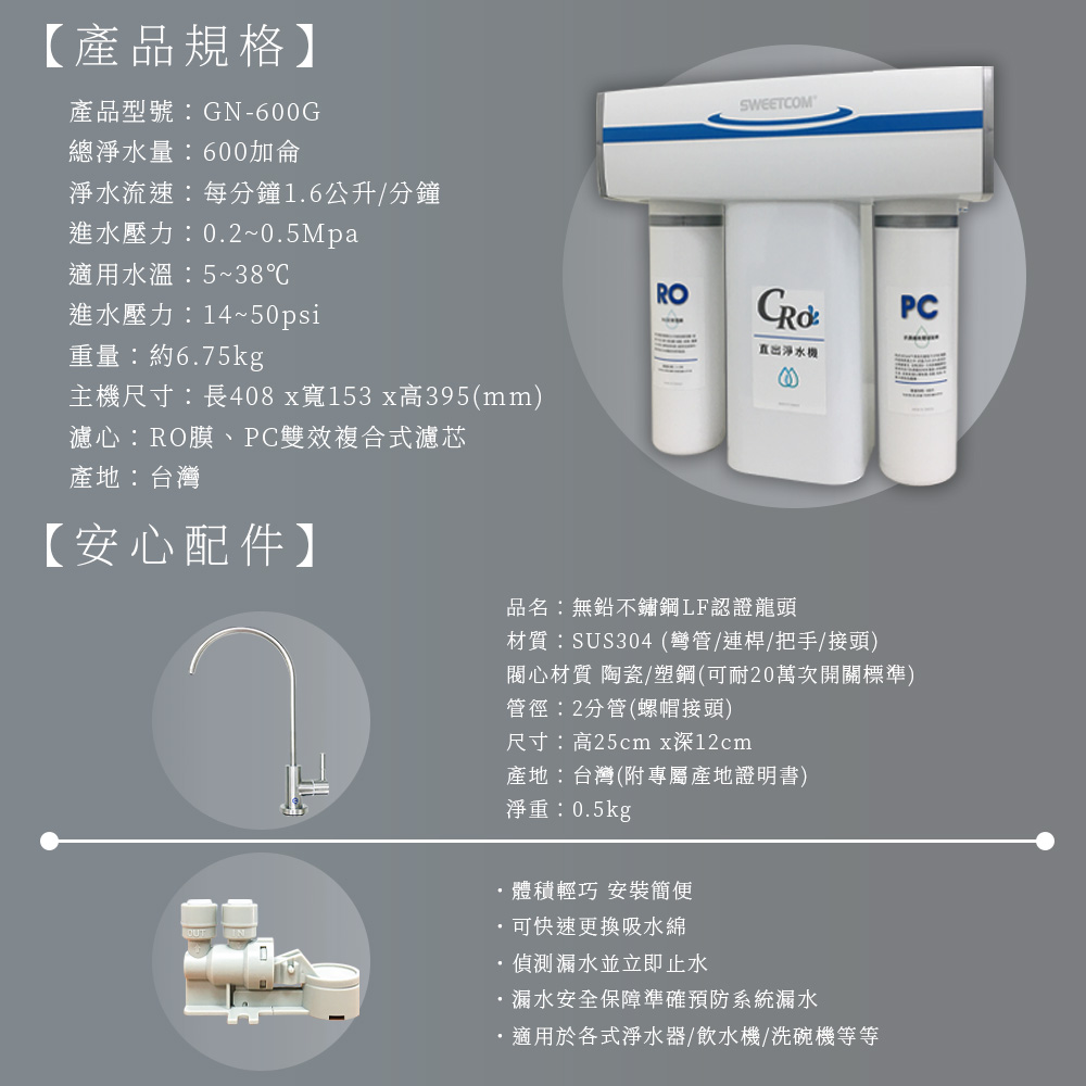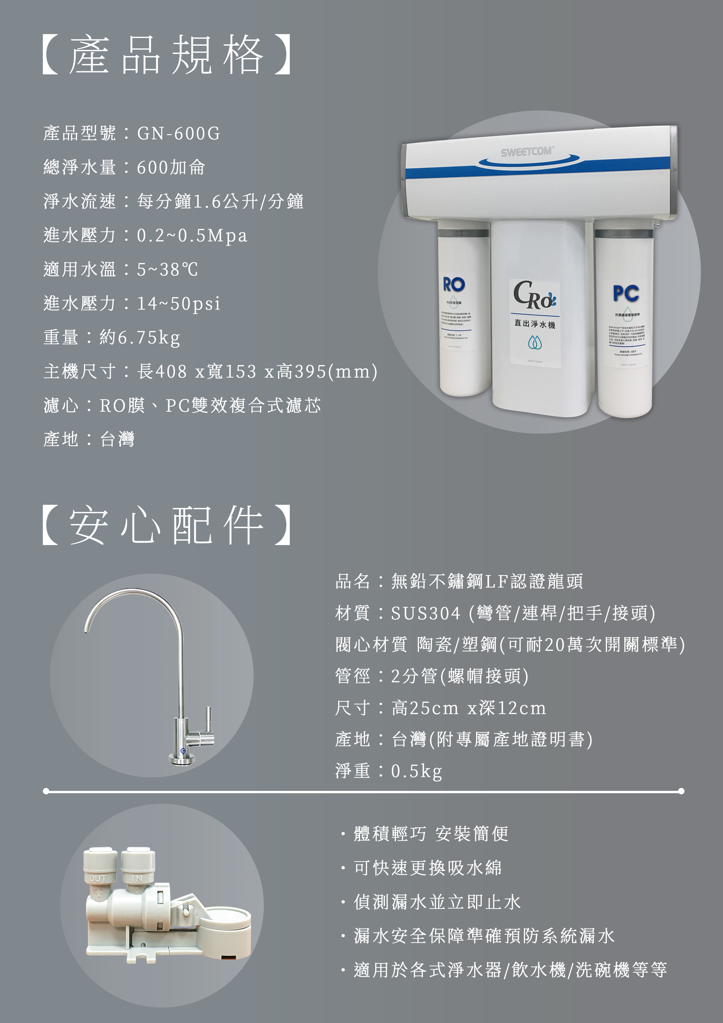 ● 主機尺寸:長408 x寬153 x高395(mm) ● 鵝頸尺寸:高250 x深120(mm) ● 總淨水量:600加侖 ● 淨水流速:每分鐘1.6公升/分鐘 ● 進水壓力:0.2~0.5Mpa ● 適用水溫:5~38℃ ● 重量:機身約6.75kg ,鵝頸0.5kg ● 搭配無鉛不鏽鋼LF認證龍頭