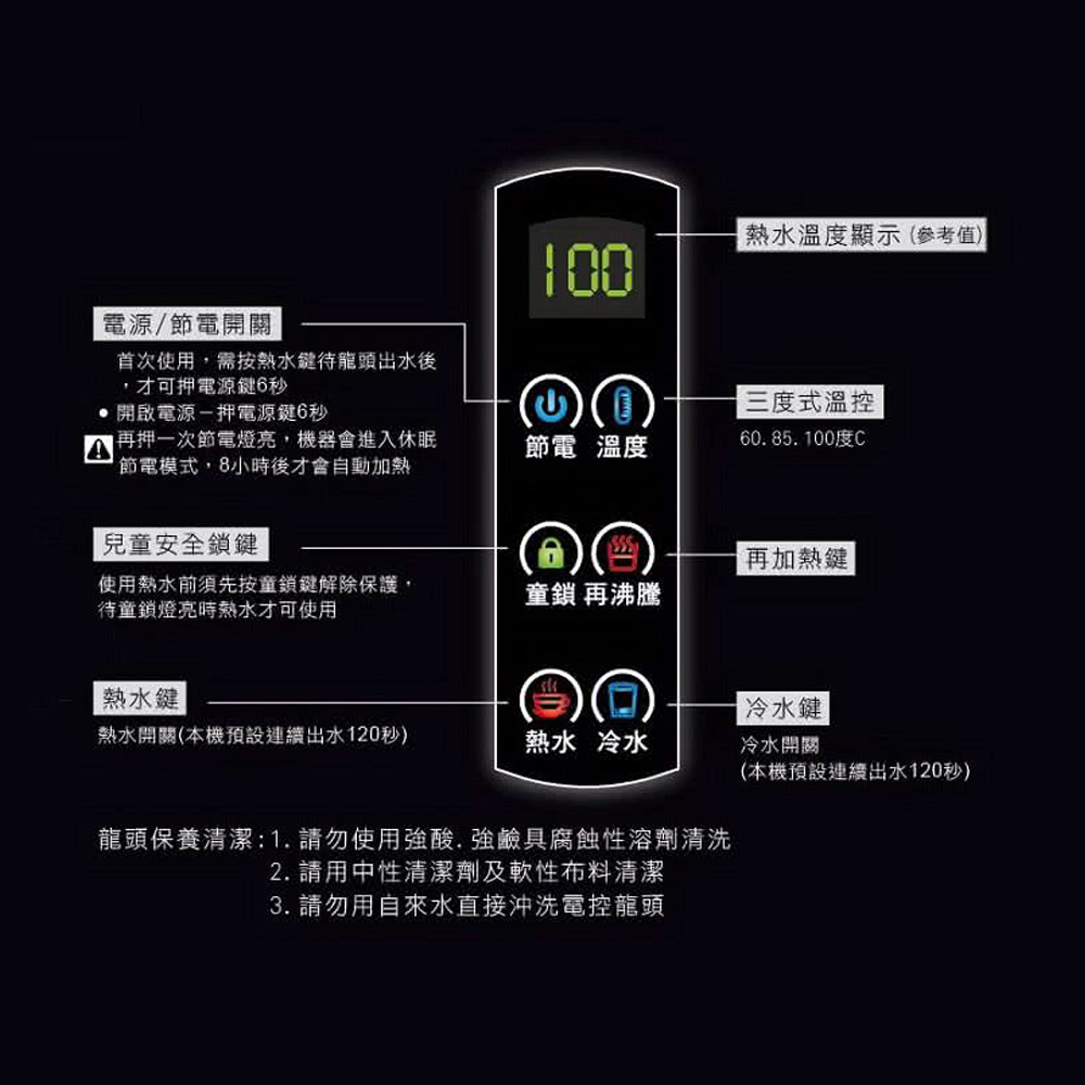 ★首次使用,需按熱水鍵待龍頭出水後,才可押電源鍵6秒