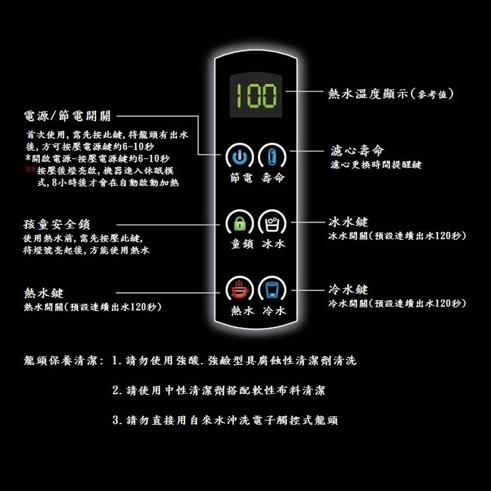 並設計節電、安全鎖、冰水、熱水與淨水、壽命之操作功能