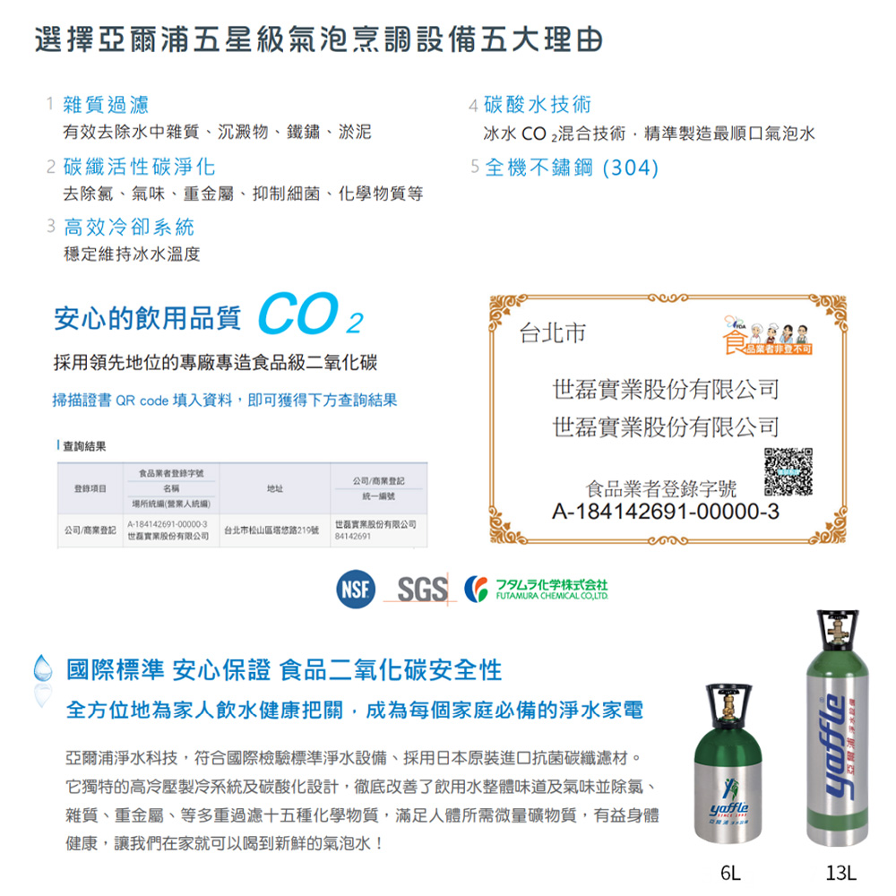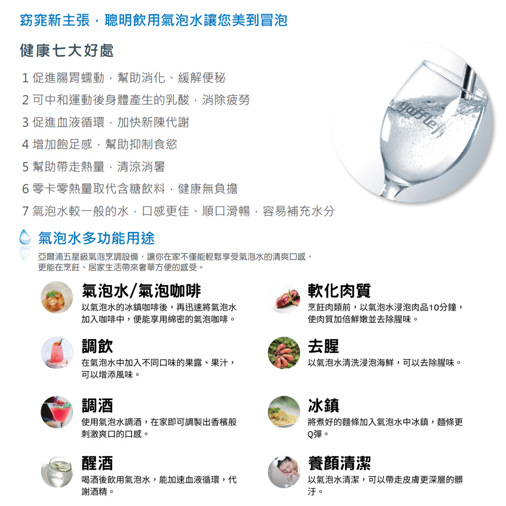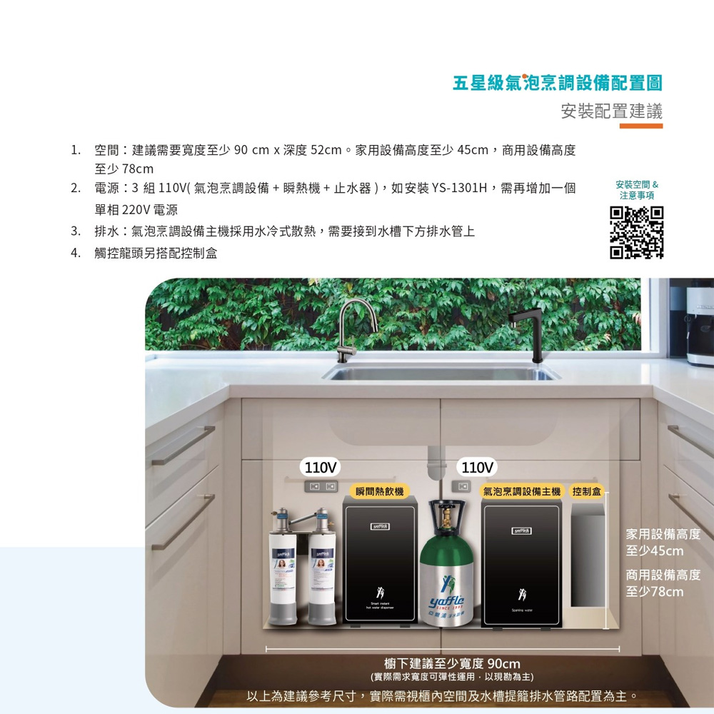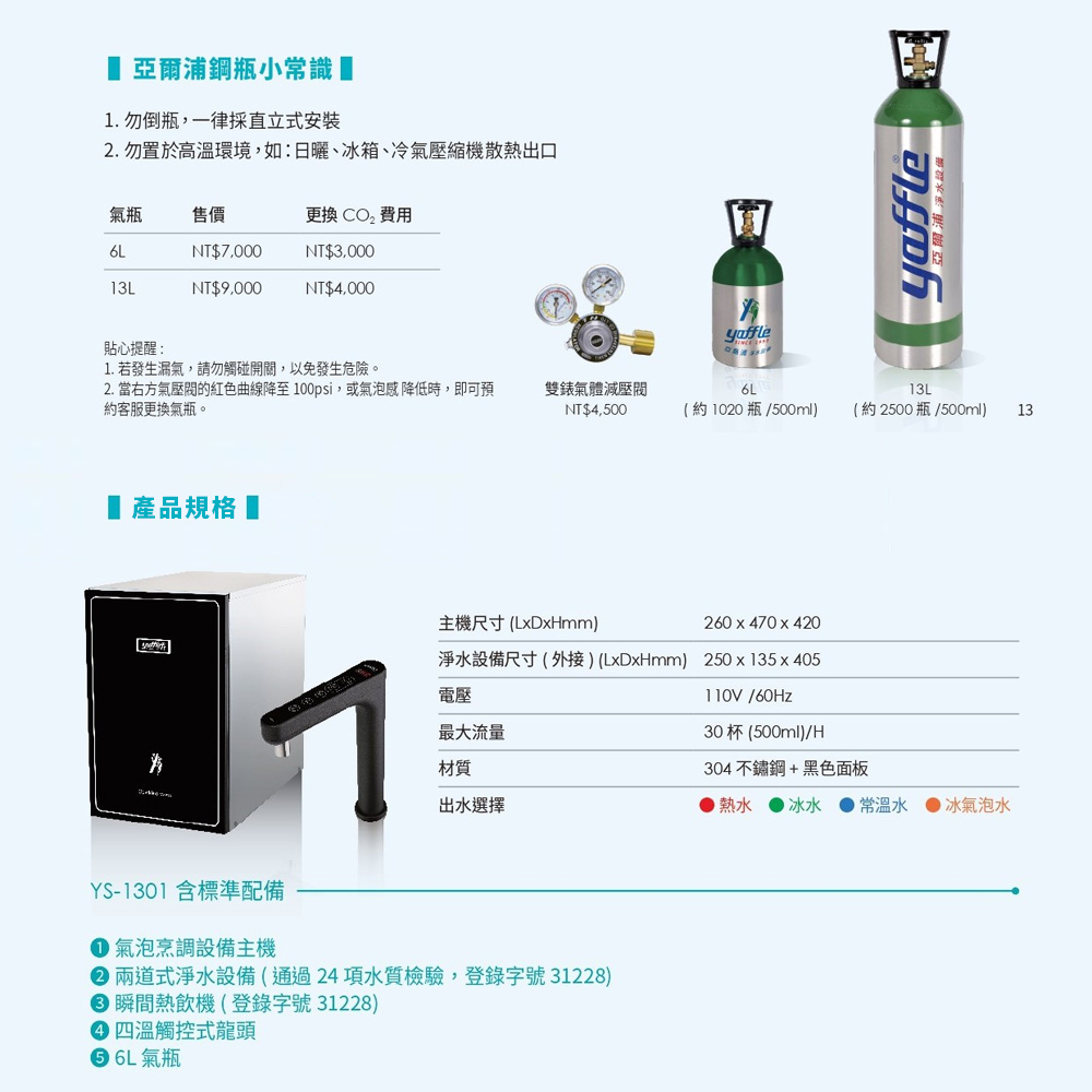 ●產品設備:氣泡烹調設備主機、觸控式四溫龍頭、兩道式淨水設備、熱飲機、6公升氣瓶